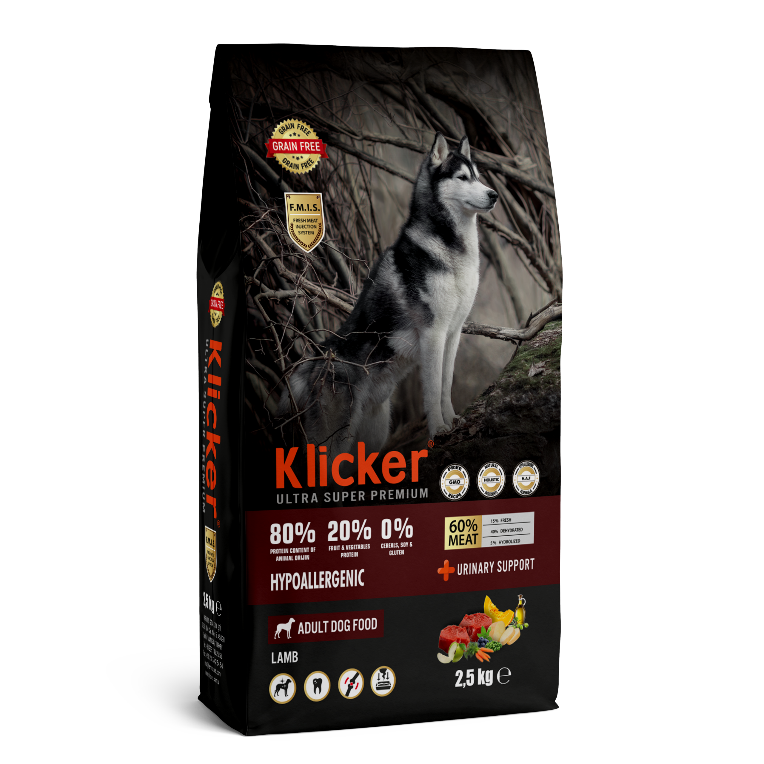 | Σύνθεση | Αφυδατωμένες και φρέσκες ζωικές πρωτεΐνες 60% (αφυδατωμένη πρωτεΐνη αρνιού 40%, φρέσκο αρνί 15%, υδρολυμένη πρωτεΐνη αρνιού 5%), πατάτες 8%, λίπος κοτόπουλου 7%, μπιζέλια, ιχθυέλαιο, μαγιά μπύρας, αποξηραμένες αντζούγιες, εκχυλίσματα φυτικών πρωτεϊνών, ζωική πρωτεΐνη, αποξηραμένη κολοκύθα, αποξηραμένα καρότα, αποξηραμένα μήλα, αποξηραμένη σκόνη κράνμπερι, αποξηραμένος βασιλικός, φύκια, σκόνη χαρουπιού, σκόνη σπόρων σταφυλιού, σκόνη ρίζας κουρκουμά, εξαιρετικό παρθένο ελαιόλαδο, γιούκα, αντιοξειδωτικά, Nupro, βιταμίνες και μέταλλα. |