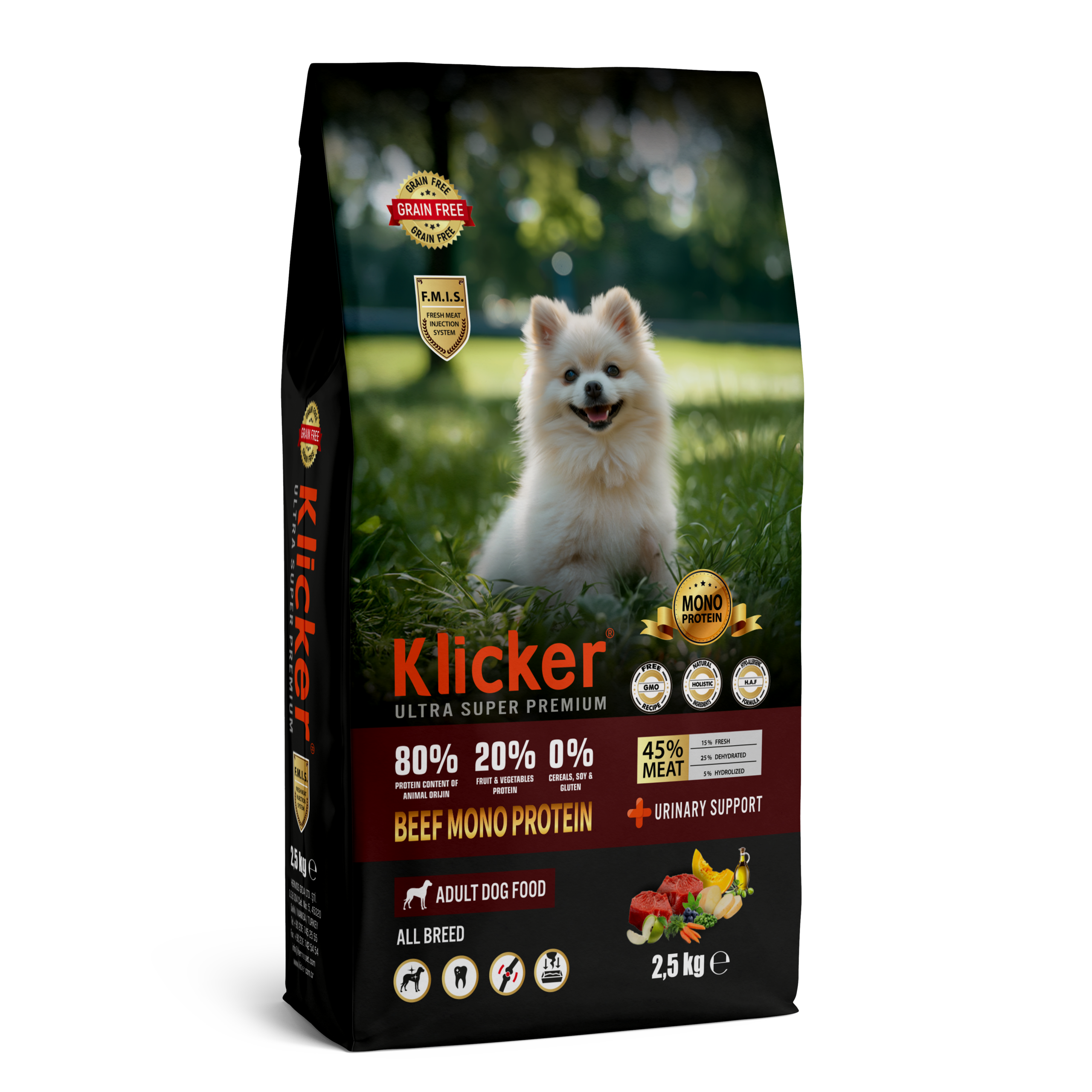 | Σύνθεση | Αφυδατωμένες και φρέσκες ζωικές πρωτεΐνες 45% (αφυδατωμένη πρωτεΐνη βοδινού 25%, φρέσκο βοδινό 15%, υδρολυμένη πρωτεΐνη βοδινού 5%), πατάτες 8%, λίπος κοτόπουλου, μπιζέλια, ιχθυέλαιο, μαγιά μπύρας, εκχυλίσματα φυτικών πρωτεϊνών, ζωική πρωτεΐνη, αποξηραμένη κολοκύθα, αποξηραμένα καρότα, αποξηραμένα μήλα, αποξηραμένη σκόνη κράνμπερι, αποξηραμένος βασιλικός, φύκια, σκόνη χαρουπιού, σκόνη σπόρων σταφυλιού, σκόνη ρίζας κουρκουμά, εξαιρετικό παρθένο ελαιόλαδο, γιούκα, αντιοξειδωτικά, Nupro, βιταμίνες και μέταλλα. |